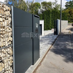 Hier zeigen wir Ihnen, was wir bei Sven Hannawald hergestellt haben: Im Schiebetor und der Pforte wurde als Füllung beidseitig ein 3mm dickes Alublech verwendet, welches der ganzen Anlage einen sehr modernen Look verleiht. Die Pulverbeschichtung in RAL 7016 wurde durchgängig für das Tor, die Pforte und die Gabionen genutzt. Die Kombination aus modernen Elementen gepaart mit den natürlichen Steinen ergibt ein harmonisches Gesamtbild und bietet Privatsphäre und Sicherheit, welche durch die verbauten elektrischen Komponenten wie Videogegensprechanlage erhöht wird. Was war die Herausforderung an diesem Projekt? Das grosse Schiebetor musste schräg gefertigt werden, da die örtlichen Gegebenheit (Hang) berücksichtigt werden musste. Wie haben habe wir das gelöst? In unserer eigen Produktion haben wir das Tor entsprechend dem Gefälle gefertigt, so dass es passgenau war, ohne das eine Lücke zwischen Tor und Boden entsteht. Mit einer zusätzlichen Rolle konnten wir auch die Schräglage ausbalancieren, zudem wurden ein verstärkter Antrieb sowie verstärkte Zahnräder eingesetzt. Des Weiteren wurde zur Sicherheit ein Bremsmodul verbaut, so dass ein unkontrolliertes Zufallen des Tores verunmöglicht wird. In der Galerie finden Sie die dazugehörigen Bilder.